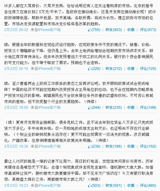 针对“房价暴跌论”,华远地产董事长任志强23日晚连发5篇微博予以反驳。任志强认为,仅以目前的个别现象为依据鼓吹楼市大跌是危言耸听,房地产业发展的大趋势并没有改变。