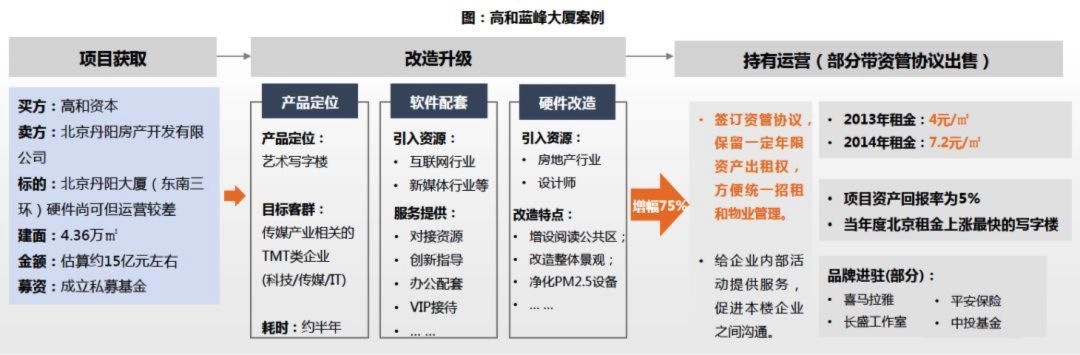 高和资本的改造物业投资特点可以概括为:一线城市商办物业、价格合理、周期适中、具有稳定现金流的成熟资产。